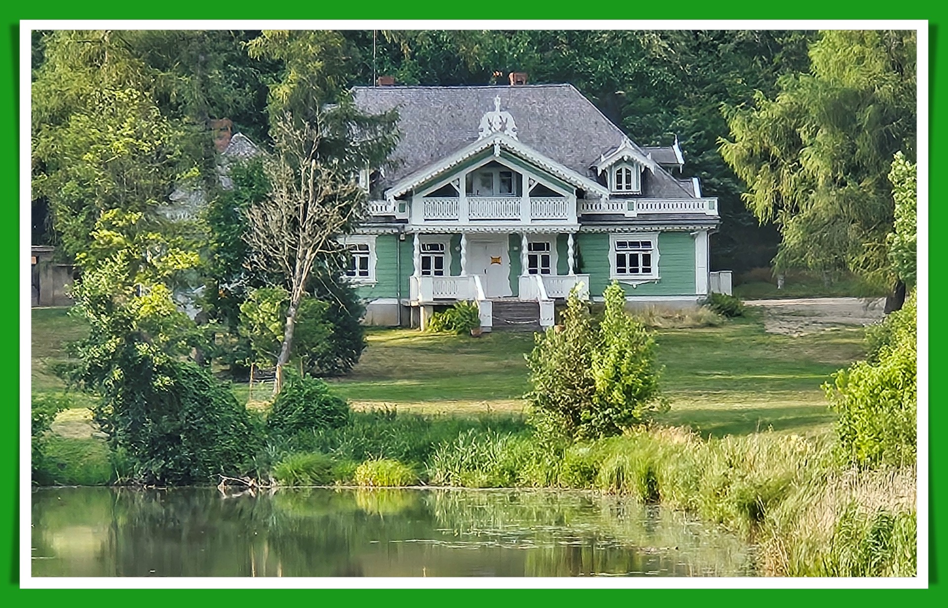 Dworek Gubernatora Grodzieńskiego. Budowla o pięknej i bogatej historii. Tym razem zastałem go w kolorze zielonkawym. Ale ciągle jest chyba w stanie remontu, modernizacji, naprawy, bo otaczały go taśmy zakazujące wstępu. Nie ważne. Jest piękny! A gdy odejdziemy dalej w stronę mostka i odbije się w stawie, to wygląda wręcz pocztówkowo.