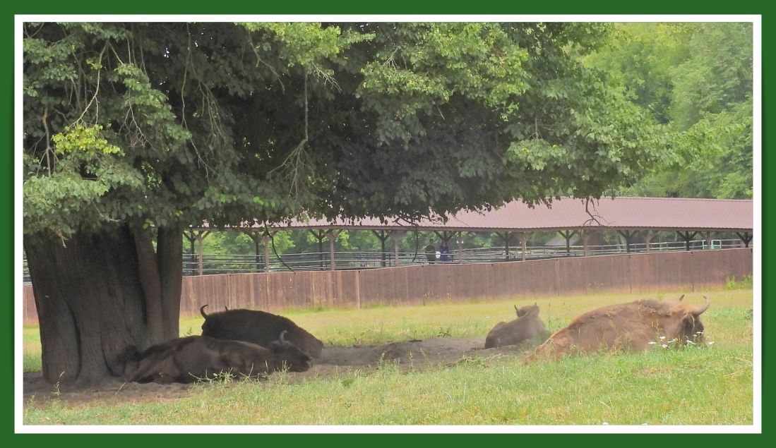 Wędrując Żebrami Żubra ok1h 30min docieramy do Rezerwatu żubrów, który tak na prawdę jest czymś na kształt małego ogrodu zoologicznego pokazującego zwierzęta żyjące w okolicy. Jak informuje Białowieski Park Narodowy "Zwierzęta w Rezerwacie eksponowane są w warunkach półnaturalnych, w dużych zagrodach pokrytych naturalną roślinnością, mogą więc nie być widoczne przez cały czas." No ja dotarłem w gorące południe, więc większość spała i odpoczywała w cieniu.