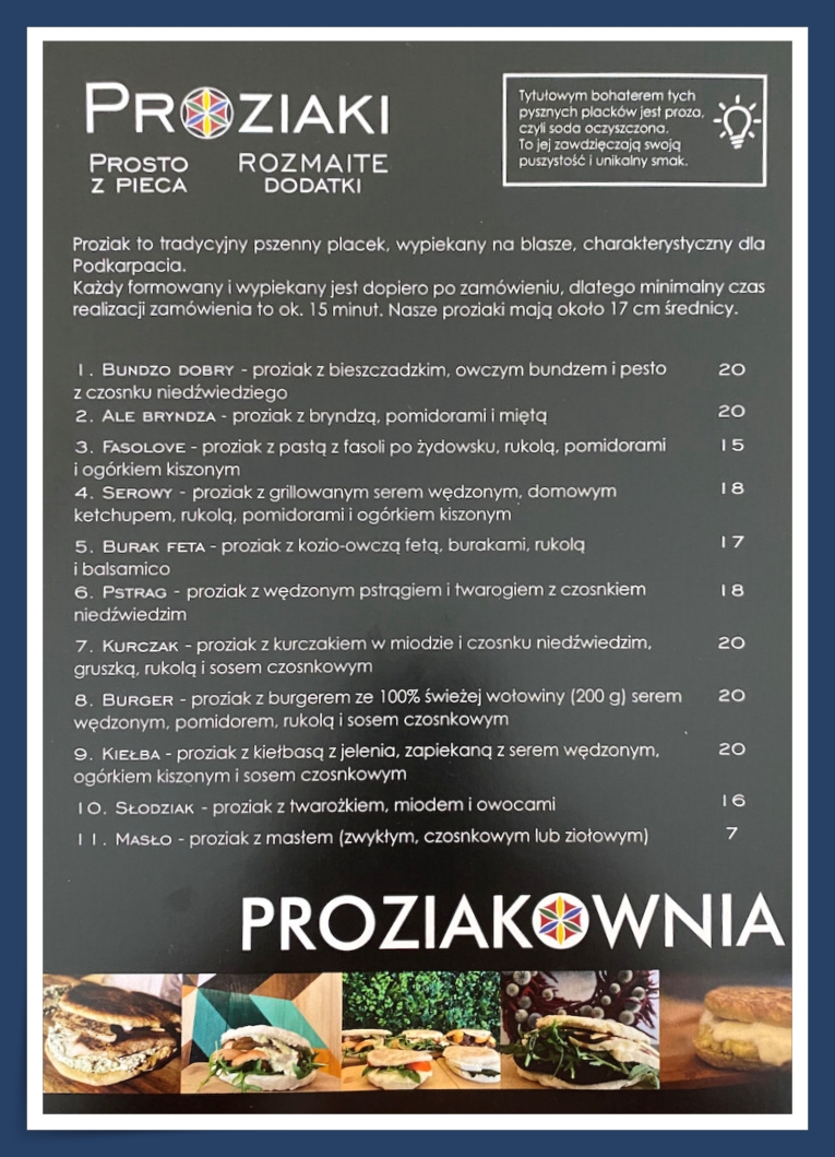 Po zwiedzaniu pora była na przekąszenie czegoś, co jest specyfiką Sanoka (tak wyczytałem) - proziaka (pszennego placka o średnicy ok 17cm). To był mój cel nr trzy. W Proziakowni na rynku (wiem, że to reklama, ale było tak pysznie, że nie mogę się oprzeć) bardzo miła pani wyjaśniła mi co to są proziaki i czym się różnią. Wybór był spory, więc nie było szansy, by spróbować każdego. A jak są podawane? Popatrzcie. Oczywiście nasyciwszy się, ani myślałem by zjeść coś jeszcze z innych potraw regionalnych w innym miejscu Sanoka.