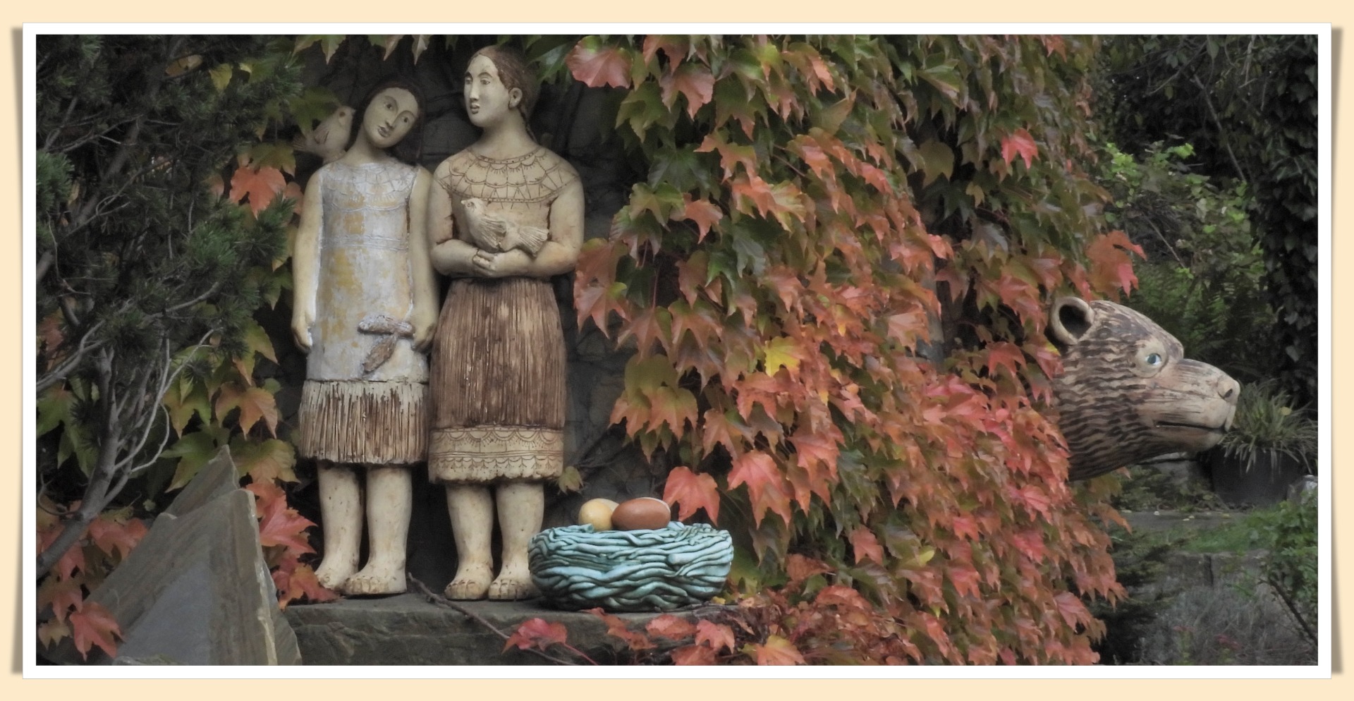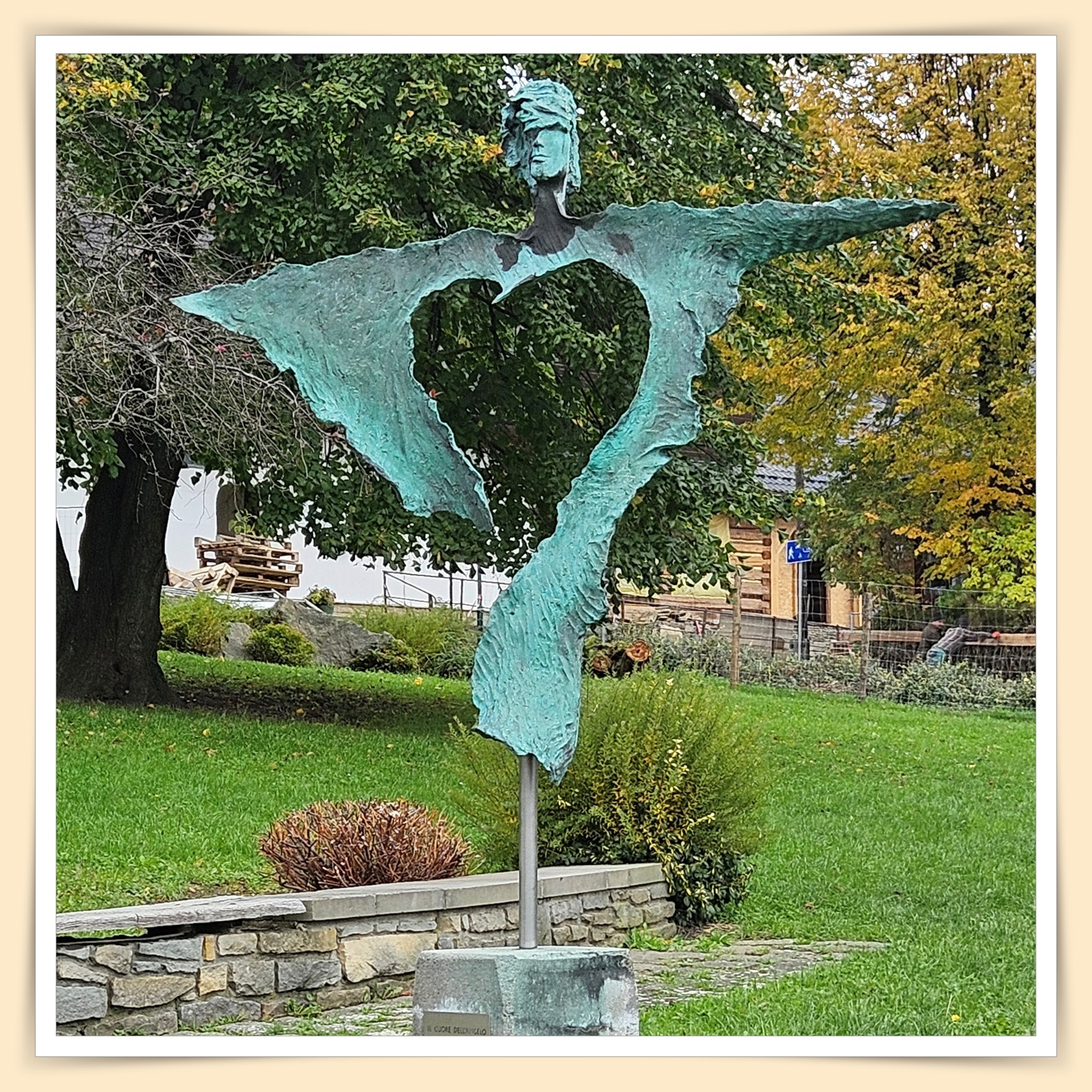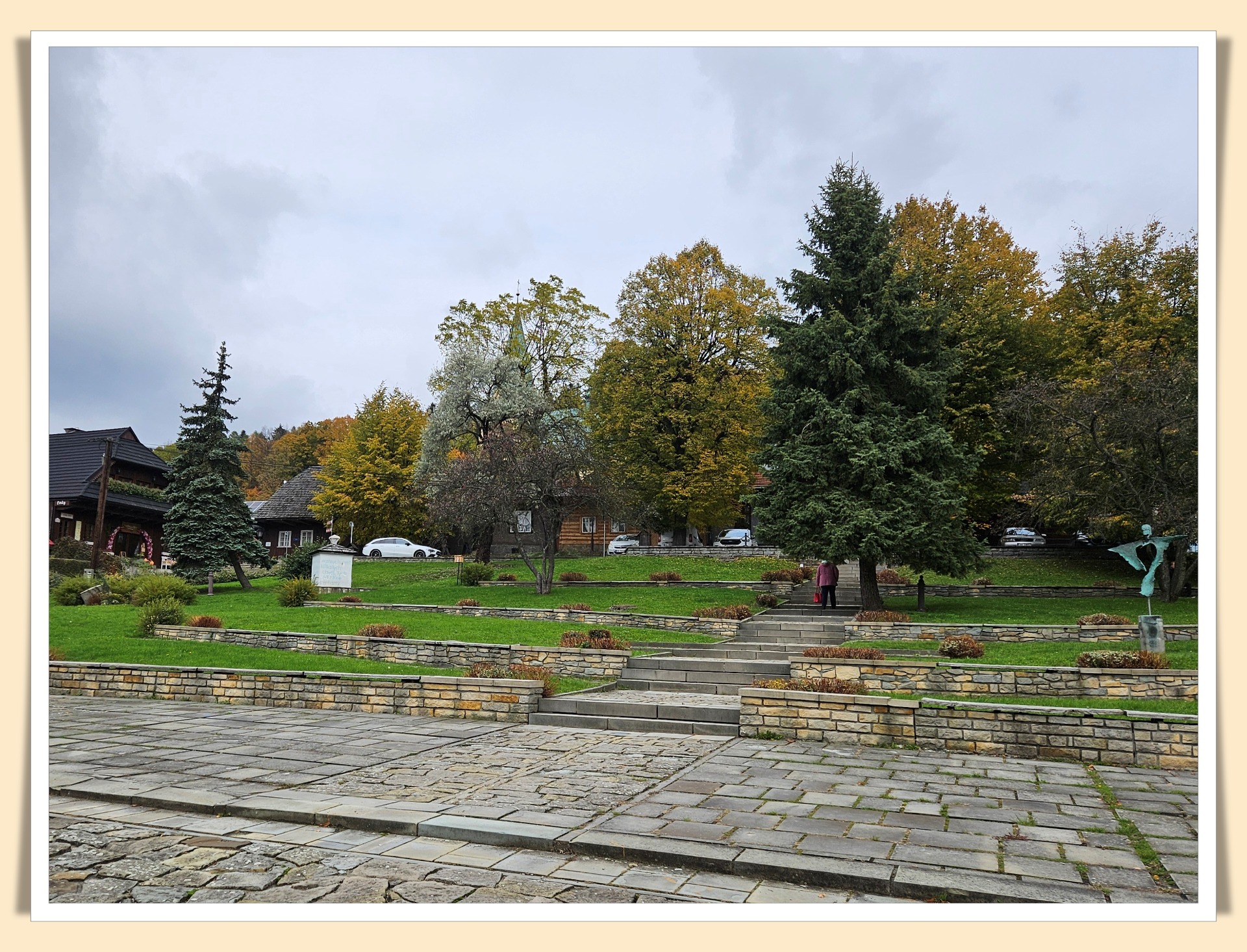 Marudzącym, że taki bardzo wyłożony kamieniami proponuję najpierw spacer dla uspokojenia. Ktoś w Internecie napisał, że "... wizyta tutaj zazwyczaj przynosi uśmiech i pozwala zapomnieć o gonitwie dnia codziennego." I dla mnie to szczera prawda. Pod jednym warunkiem - że jeśli tu przyjechaliście, to powinniście się nastawić właśnie na uśmiech i zapomnienie o gonitwie. Inaczej wyjazd staje się daremny. Poza tym, nawet na tym pochylonym placu jest sporo zieleni i miejsca, gdzie można przysiąść w jesiennym słońcu.
