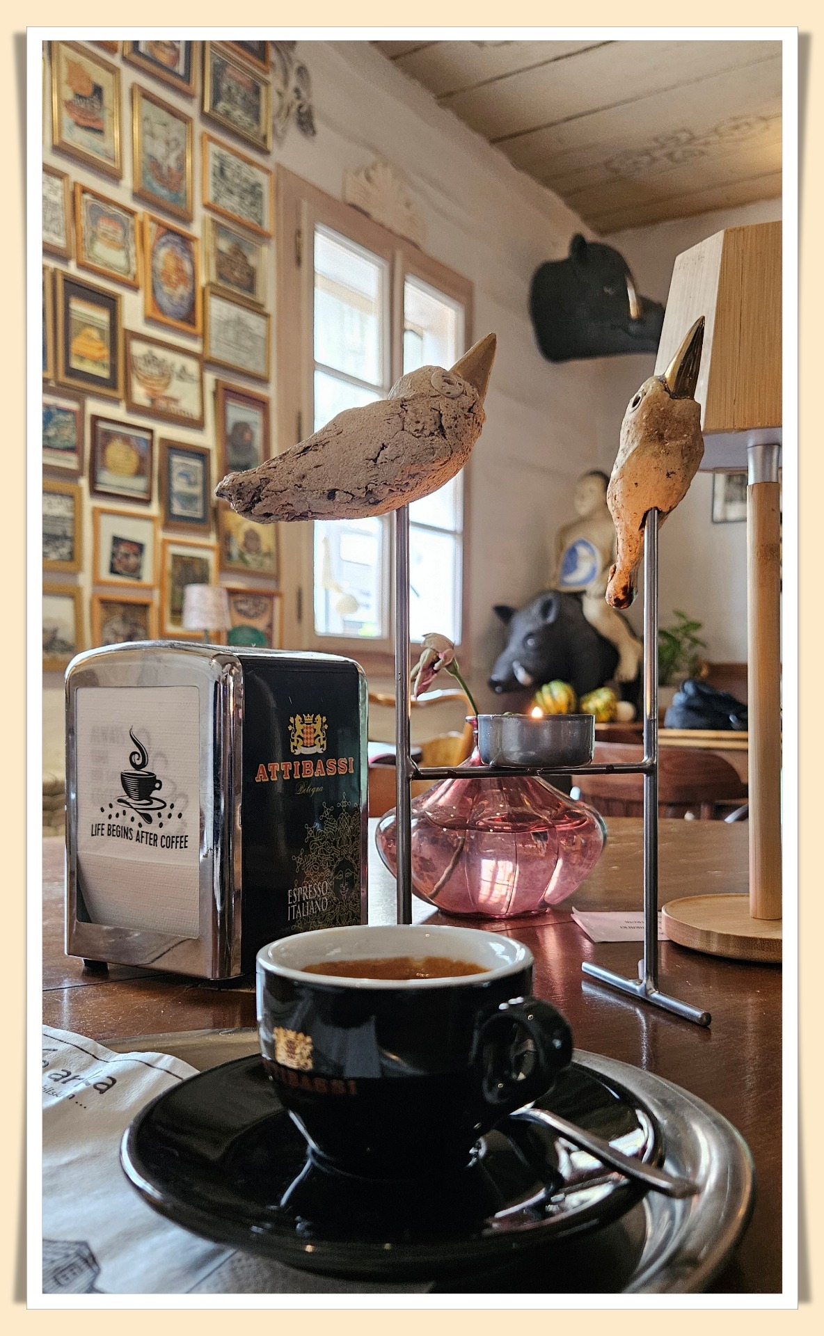 W imieniu Pani zza baru (mam na to Jej zgodę) zapraszam serdecznie cytatem z serwetki "cafe arka, zabierz ze sobą bliskich ...". Zamawiacie i siadacie. Delektujecie się atmosferą miejsca, oglądacie, oglądacie, oglądacie. Łyk kawy albo naparu, kęs ciasta i od nowa. Delektujecie się .... I niech tam sobie siedzi obok ktoś, kto akurat pisze lub dyskutuje o sztuce. Takie miejsce.